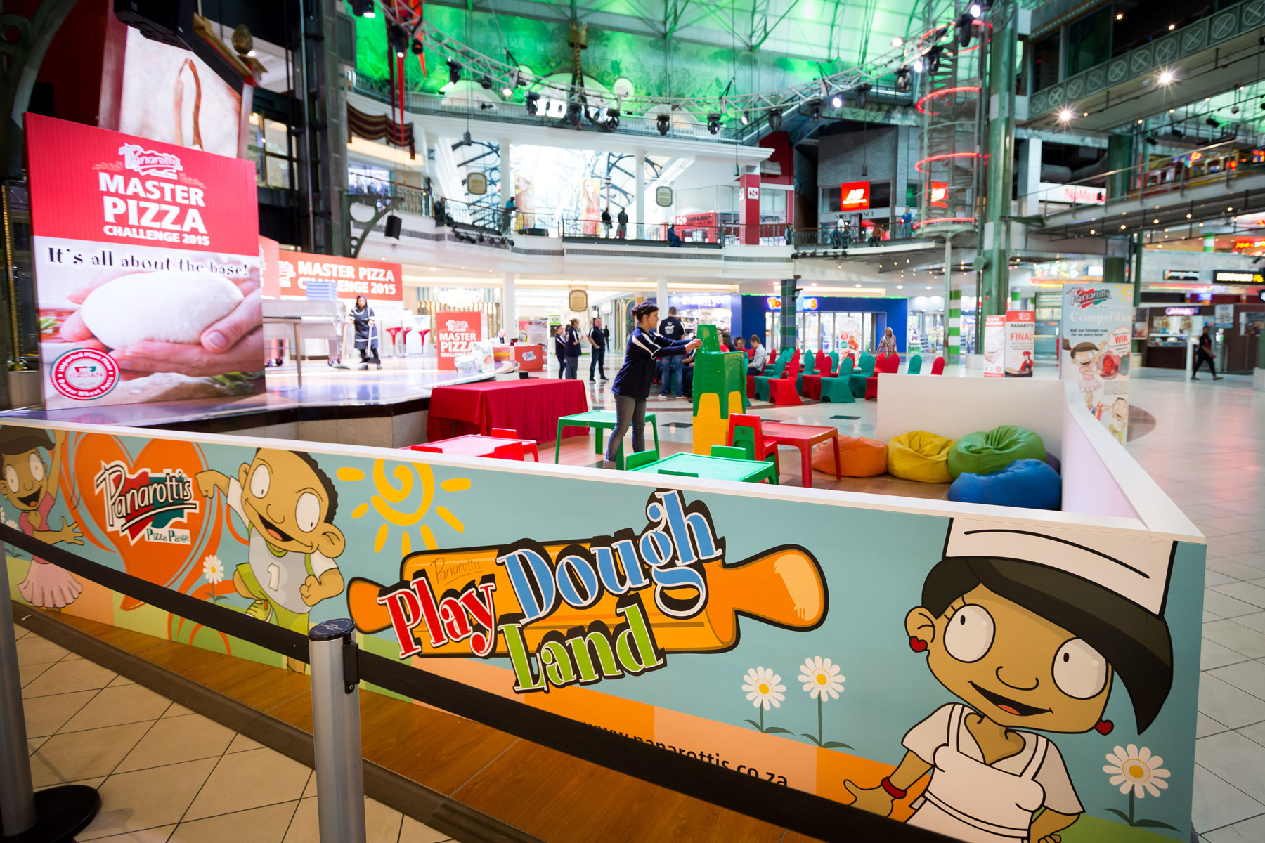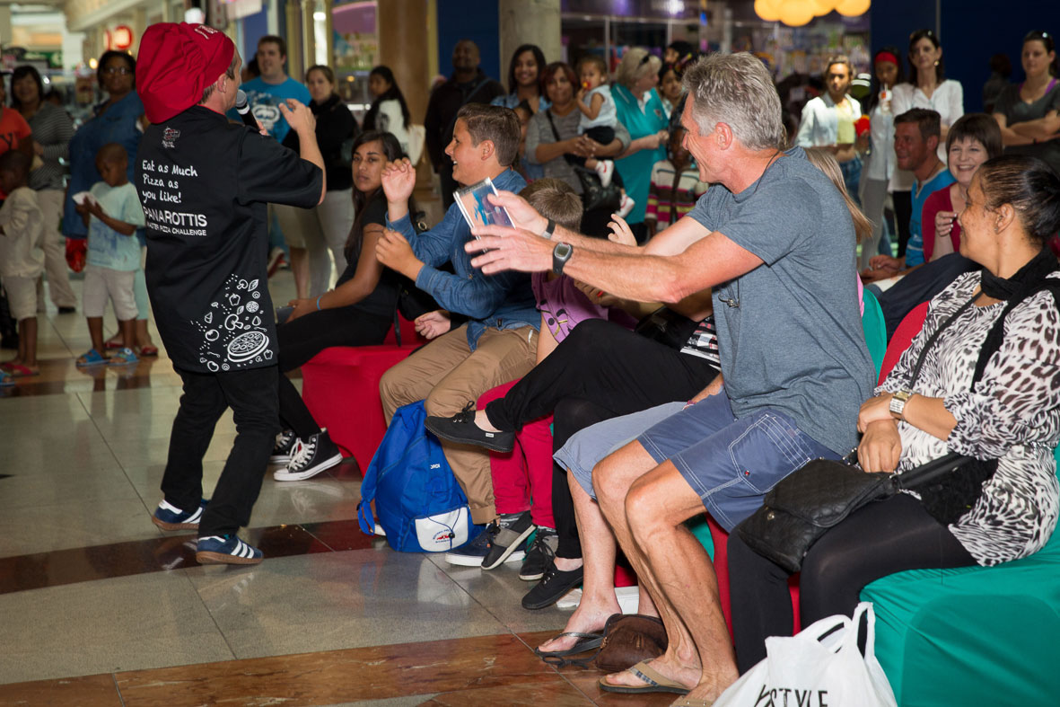 The Panarottis Master Pizza Championship takes place at Canal Walk’s centre court, in Cape Town. It is an all-day event, where each contestant has the opportunity to prepare their own pizza for the judges and audience to sample. In between each contestant’s turn, while the stage and prep stations were being reset, audience members play games and enjoy fresh-from-the-oven pizza slices. The event has a constant stream of audience members, who enjoy a day filled with pizza, audience-participation games, family challenges, prizes, and our hilarious local comedian MC, who entertains the audience and keeps the day running smoothly.